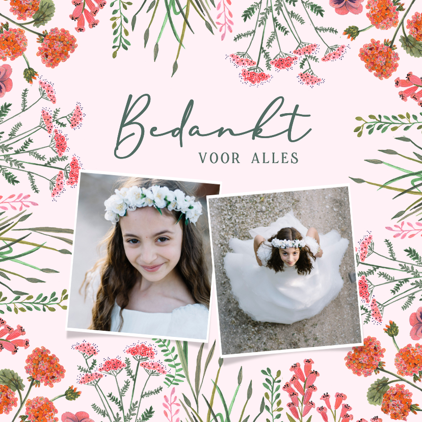 Een schattige bedankkaart voor je eerste communie feestje met mooie geschilderde veldbloemen op een roze aanpasbare achtergrond.