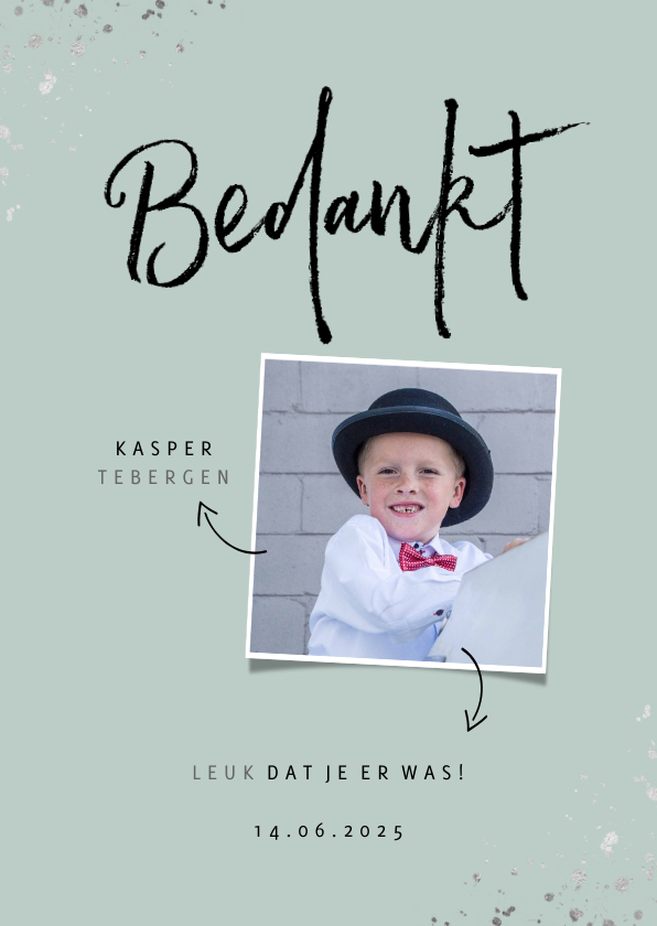 Hippe & Stijlvolle communie bedankkaart met zilveren (geen folie) spetters, 'Bedankt' en plek voor een foto. Achtergrondkleur is aan te passen.