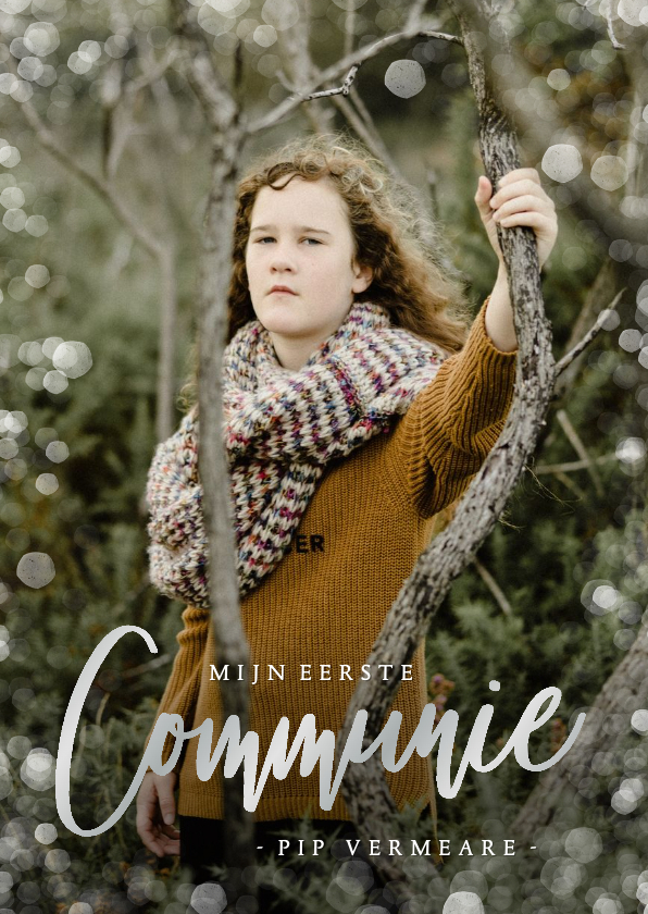 Stijlvolle uitnodigingskaart voor een communie feest van een meisje of jongen. Met zilveren letters en 1 grote eigen foto. Met of zonder foliedruk.