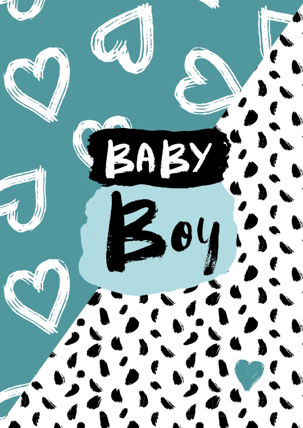 Hippe felicitatiekaart voor de geboorte van een jongen, met trendy zwartwit patroon en blauwe hartjes.