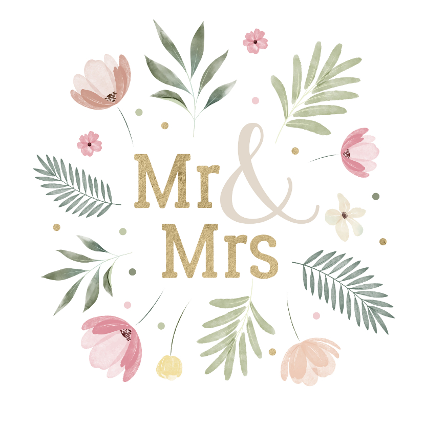 Fleurig kaartje om het pas gehuwde paar in de bloemetjes te zetten. Geen foliedruk.