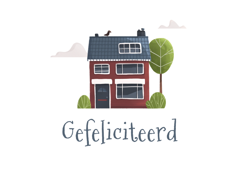 Een vrolijk felicitatiekaartje voor iemand die een nieuw huis heeft (gekocht). Met huisje, boompje en vogeltje.