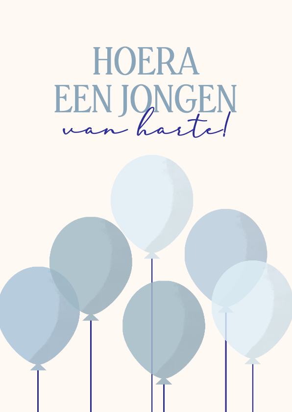 Een vrolijk felicitatiekaartje voor geboorte van en zoontje. Op de kaart staan blauwe ballonnen.