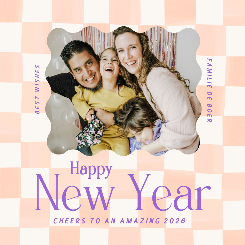 Trendy hippe fotokaartjes met geblokt patroon in licht oranje. Met foto in moderne kader met golvende rand. Met paarse typografie 'Happy New Year'.