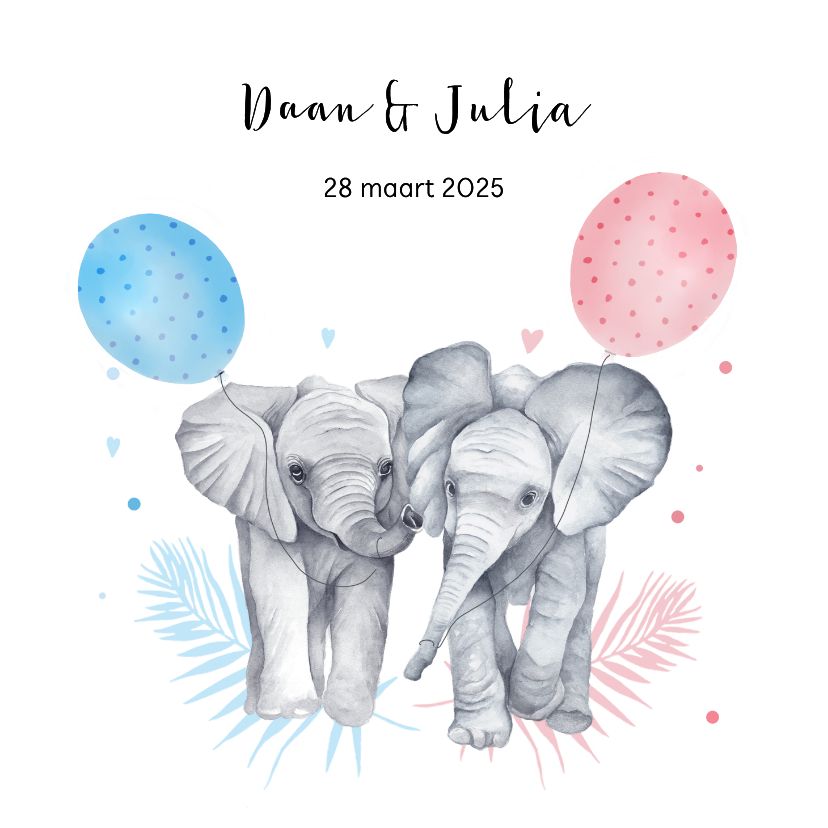Geboorte voor een tweeling meisje en jongen met twee lieve olifantjes met ballonnen in hun slurfjes