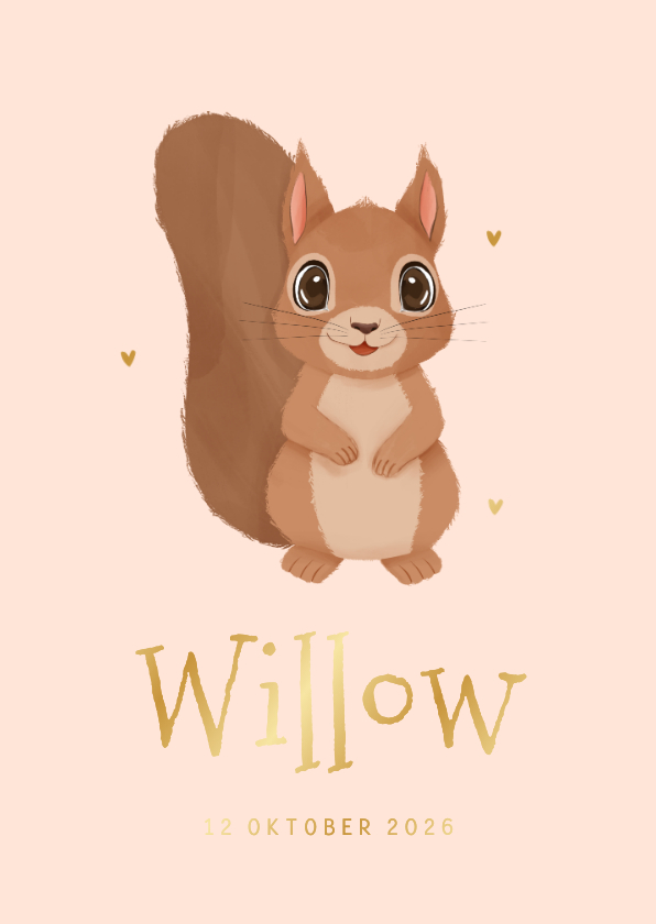 Lief geboortekaartje met een illustratie van een eekhoorntje op de voorkant. De achtergrondkleur is aanpasbaar. Met kleine gouden hartjes.