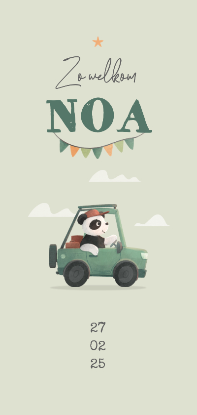 Geboortekaartje panda auto wolken sterren vlaggetjes