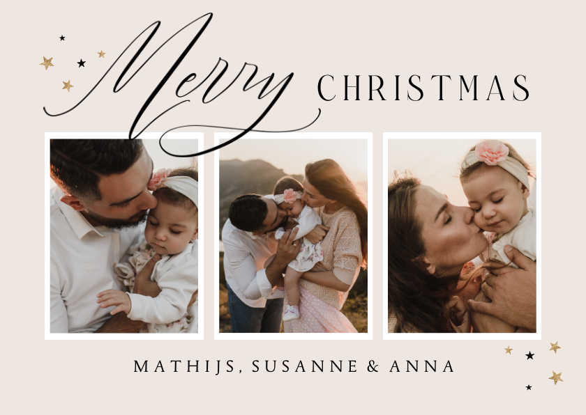 Een stijlvol en persoonlijk kerstkaartje met drie eigen foto's en gouden sterretjes.