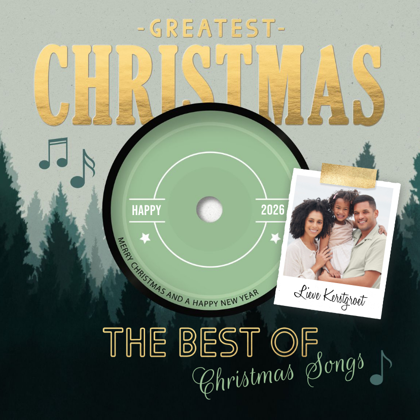 Origineel kerstkaartje van een LP met kerstbomen, tekst Greatest Christmas The Best Of (geen goudinkt). Plaats je eigen foto op een uniek kerstkaarten