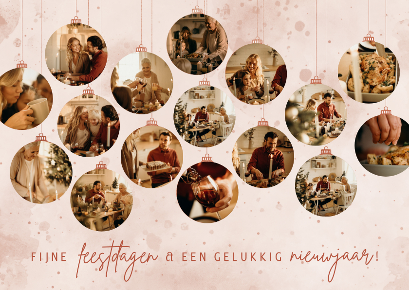 Vrolijk, licht kerstkaartje met zestien koperlook kerstballen en dus ruimte voor zestien foto's! Alle tekst is aanpasbaar.