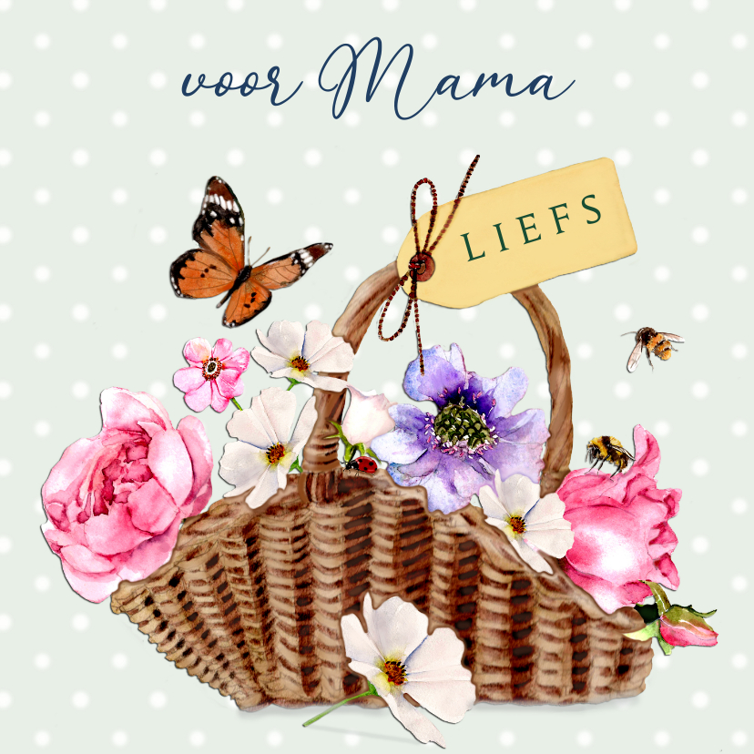 Een stijlvolle moederdagkaart met op de voorkant een rieten mand vol bloemen. Gemaakt in aquarel.