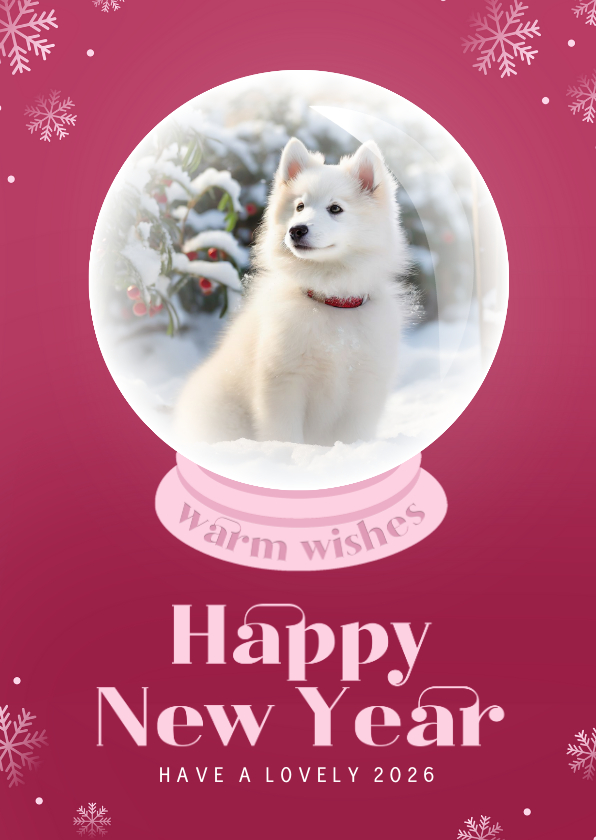 Een bijzonder nieuwjaarskaartje in trendy roze met een illustratie van een snow globe met daarin ruimte voor eigen foto's en sneeuwvlokken.