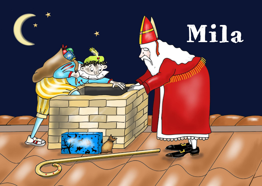 Sinterklaas en piet zijn op het dak, piet klimt in de schoorsteen, straks zit er een verrassing in de schoen! Pas de naam van het kind aan.