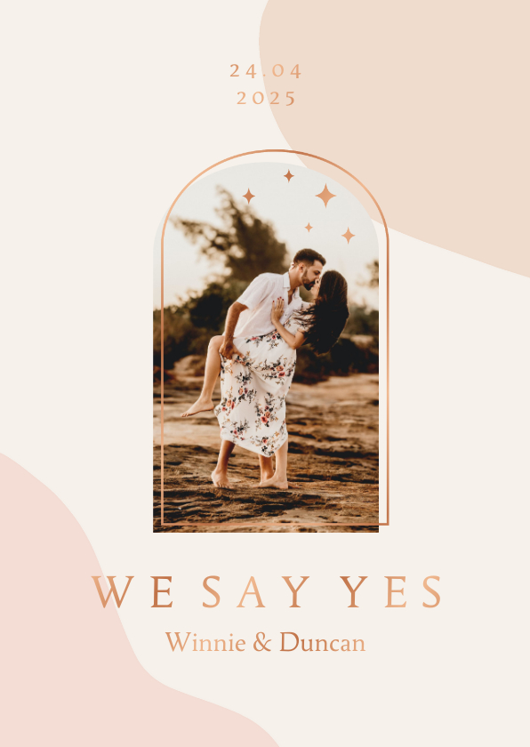 Deze trendy trouwkaart in roze aardetinten heeft een foto met boog en sterren. De kaart is met of zonder foliedruk te bestellen.