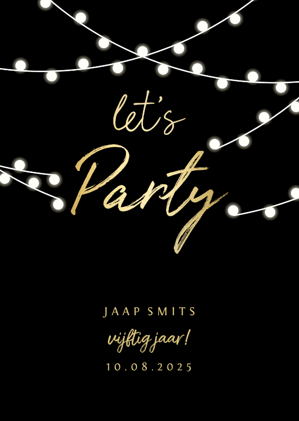 Uitnodiging gouden 'let's party' met lampjes