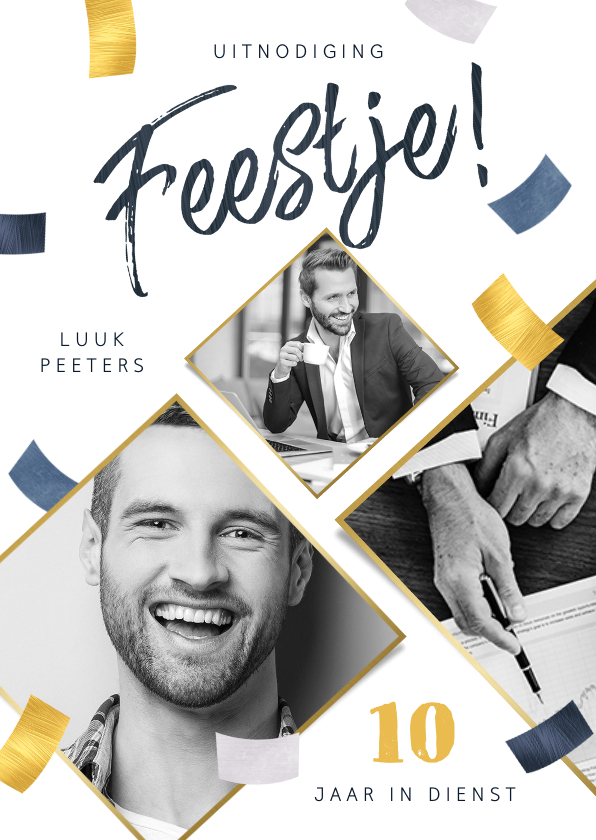 Een feestelijke uitnodigingskaart voor een werknemer die X jaar in dienst is. Leuk met eigen foto's en confetti op de voorzijde.