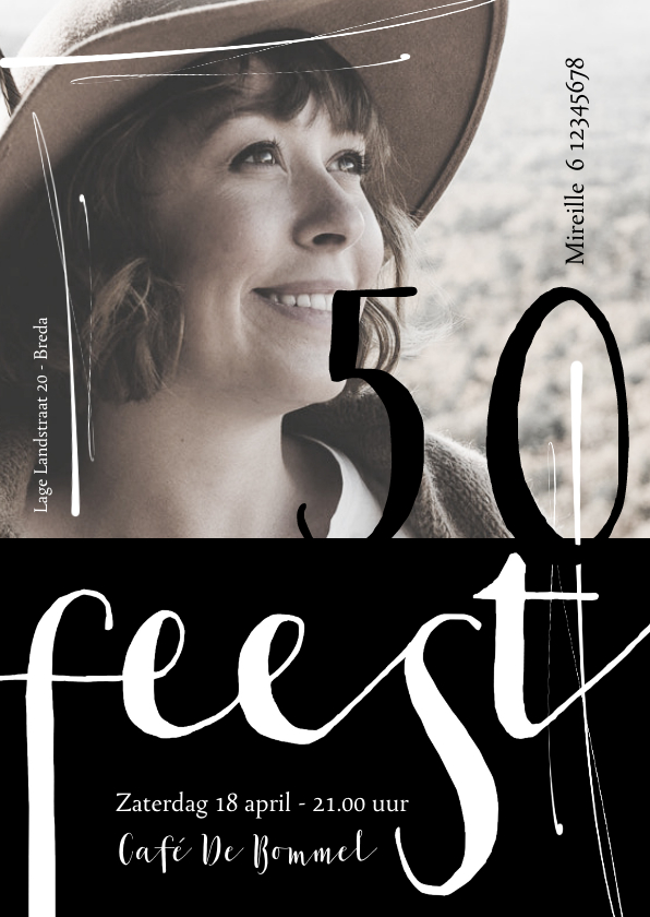 Moderne uitnodiging voor 50ste verjaardag, met grote foto en zwart vlak met in grote witte letters 'feest'. Speelse lijnen en speelse typografie.