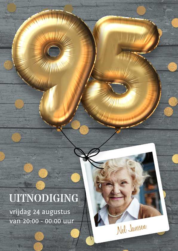 Feestelijke en originele uitnodiging voor een verjaardag van 95 jaar. Met ballonnen, confetti en foto.