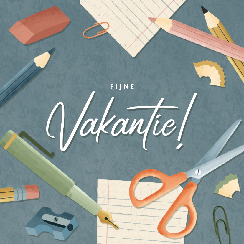 Leuke vakantiekaart om de leerlingen een fijne schoolvakantie te wensen! De kaart heeft een pen, schaar, potloden, gum en tekst 'fijne vakantie!'.