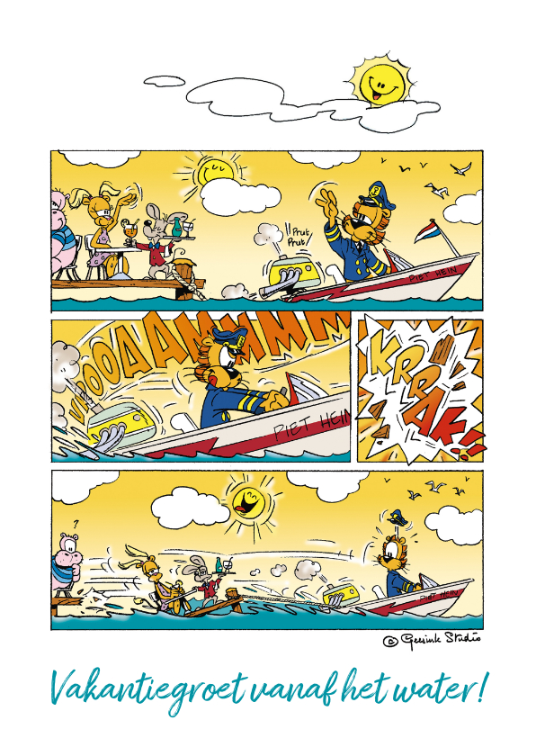 Vakantie met de boot of een dagje varen. met Loeki als kapitein van een snelle speedboat. Leuke vakantiegroet, uitnodiging of felicitatie vaarbewijs!