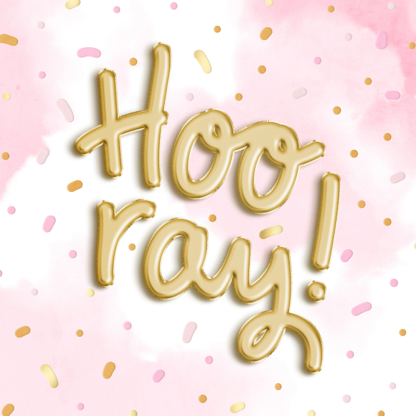 Hippe verjaardagskaart met de tekst 'Hooray!' als ballon, met leuke confetti en waterverf op de achtergrond.