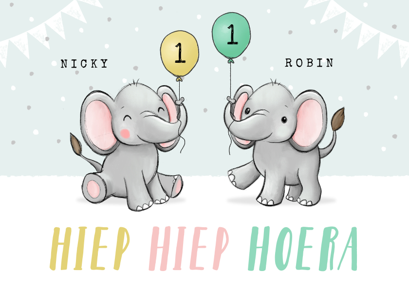 Feestelijke felicitatiekaart voor een tweeling unisex met lieve feestende olifantjes., slingers en confetti. Leeftijd is aanpasbaar.