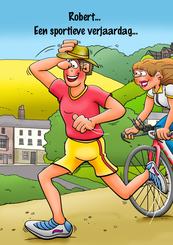 Grappige verjaardagskaart voor een man die aan het sporten is. Hij wordt gegroet door een sportieve fietster. Alle teksten kan je aanpassen.