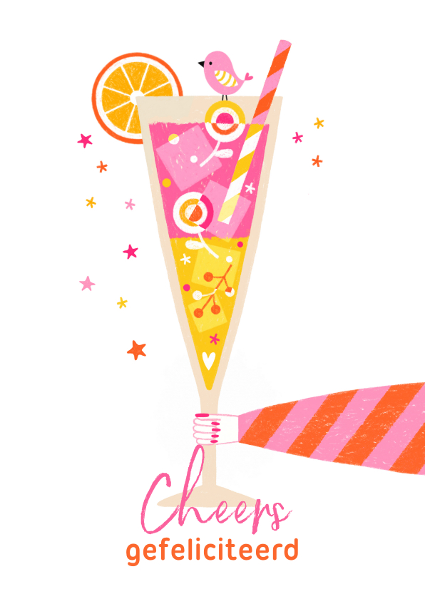 Leuke felicitatiekaart met een arm met een feestelijke cocktail, met een vogeltje, op een witte achtergrond. Cheers!