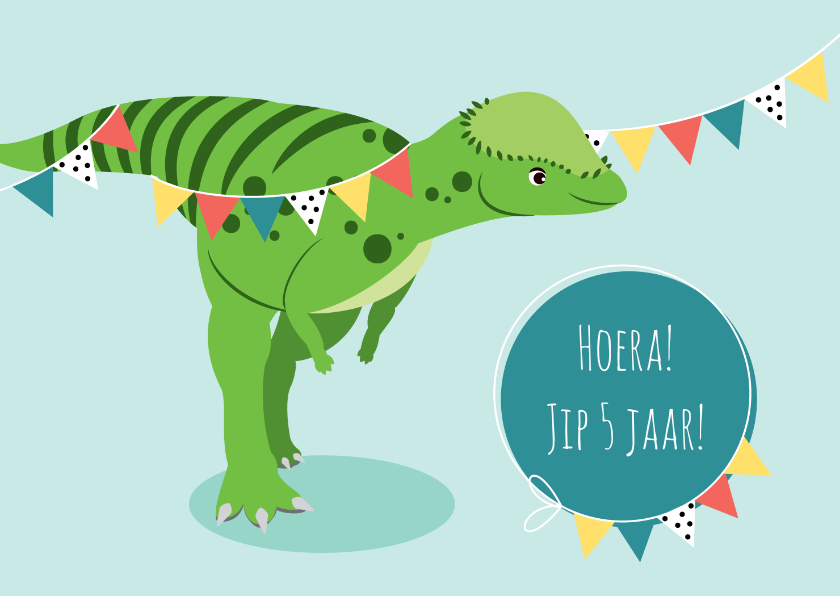 Deze stoere maar vriendelijke dino feliciteert de jarige jop graag voor je. Achtergrondkleur en tekst aanpasbaar.