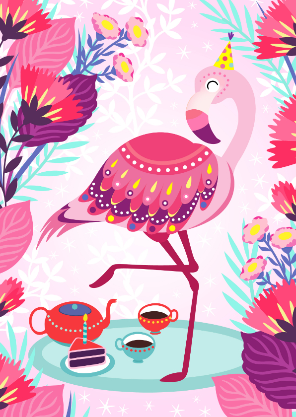 Vrolijke en kleurrijke verjaardagskaart met flamingo, taart, koffie en bloemen. Je kunt zelf de tekst aanpassen binnenin de kaart.