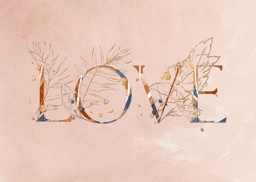 Stijlvolle kaart met LOVE tekst geschreven in trendy gekleurde bloemen en goud look. Maar eigen smaak aan te passen.