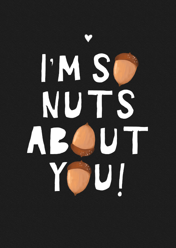Leuke stoere liefdeskaart "I'm so nuts about you" met eikeltjes, hartjes en eigen foto aan de binnenzijde van kaart!
