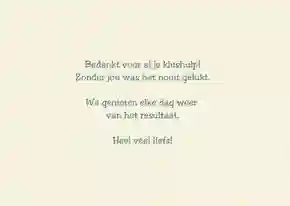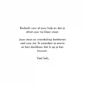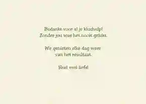 Hoe maak je nu zo’n persoonlijk bedankkaartje voor de handige man of vrouw die je onlangs bij het klussen hielp? Kies een bedankkaartje uit onze collectie of maak er zelf een met de kaartenmaker. Je kan de kaart volledig aanpassen naar je eigen smaak door een eigen foto toe te voegen of er een persoonlijke tekst bij te plaatsen (surf ook eens naar onze teksten voor bedankkaartjes) en door ze te versieren met grappige figuurtjes of een kader. Maar het hoeft natuurlijk niet altijd om een bedankkaartje voor een klusser te gaan. Je kan ook je babysit eens verrassen met een lief bedankkaartje. Wij hebben zoveel soorten bedankkaartjes dat je er vast en zeker iets tussen vindt dat bij jouw helpende hand past.