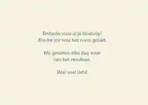 Je kent een Handige Harry of Henriëtta die je geholpen heeft met de renovatie van je huis of met het fixen van een lekkende kraan? Stuur hem of haar een bedankje met een bedankkaart, want dat heeft deze persoon wel verdiend, vind je niet? Bij Kaartje2go hebben we allerlei soorten bedankkaartjes om Handige Harry’s en Henriëtta’s te bedanken voor dat tikkeltje extra steun. Selecteer een bedankkaartje uit onze galerij of maak er zelf een met de kaartenmaker. Voeg een foto toe van het resultaat en werk de kaart af met grappige figuurtjes. De ontvanger voelt op die manier dat hij of zij je echt uit de nood geholpen heeft.