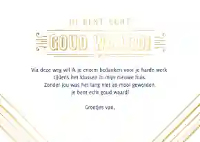 Bij Kaartje2go kun je snel en gemakkelijk een uniek en origineel bedankkaartje maken voor iemand die je bij een klus in huis geholpen heeft. Bovendien kosten onze bedankkaartjes absoluut niet veel, dus je kan er al eens eentje meer sturen.