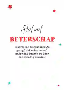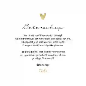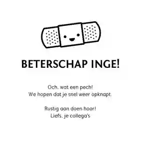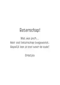 Wat een pech; je vriend(in), collega of familielid heeft een ongelukje gehad en daarmee een arm of been gebroken! Dat wordt een flink aantal weken rondlopen (of rollen) met een spalk of zelfs gips. Je wilt natuurlijk jouw beste beentje voorzetten en deze persoon zo goed mogelijk ondersteunen bij de dingen die hij/zij nu niet meer goed zelf kan. Laat de pechvogel daarom weten dat je voor hem/haar klaarstaat met een opbeurende beterschapskaart. Vind je het lastig om te bedenken wat je op de kaart moet zetten? Bekijk dan onze beterschapsteksten om je te helpen bij het vinden van de juiste woorden.