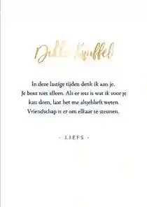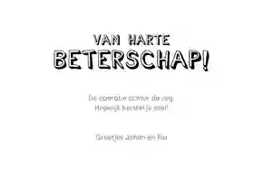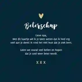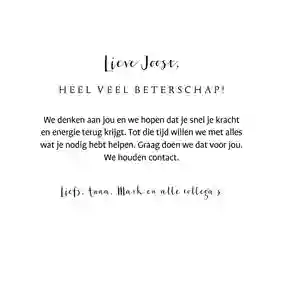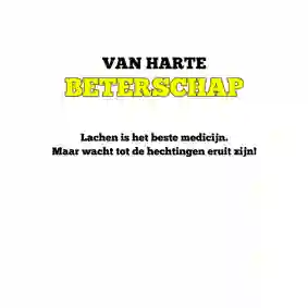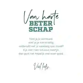 Het sturen van een beterschapskaart aan een man kan uiteenlopende redenen hebben. Daarom hebben onze designers verschillende soorten beterschapskaarten gemaakt. Zo zitten er in onze collectie kaarten voor mannen die ernstig ziek zijn, een operatie moeten ondergaan of iets gebroken hebben. Ook is het mogelijk om een man een beterschapskaart te sturen voor een burn-out of een depressie. Niet zeker welke beterschapskaart het meest geschikt is voor de man in kwestie? Een algemeen kaartje met ‘Dikke knuffel’ of ‘Opkikkertje’ is gepast in vrijwel alle situaties.