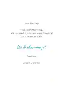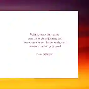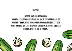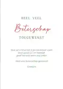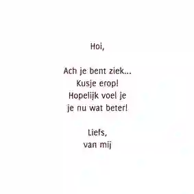 Ben je klaar met het aanpassen van de beterschapskaart? Dan is het tijd om de kaart te bestellen en versturen. Vul het adres van de zieke man (of het ziekenhuis) in en kies een verzendmoment. Wij doen de kaart voor je op de post en voor je het weet heeft je zieke vriend, buurjongen, broer, vader of opa een kaart met een beterschapswens die echt bij hem past. Voeg eventueel een cadeau aan je bestelling toe en tover een glimlach op het gezicht van de zieke man. Wat dacht je bijvoorbeeld van een kleinigheidje als een reep chocolade, een bierpakket of een doosje thee?