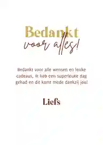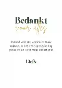 Als je zoon of dochter geen heilige communie doet, is het superleuk om een lentefeest te vieren. Dat is geen christelijk feest, maar wel een fijne manier om je kind te laten stralen. Ook bij een lentefeest is het mooi om vriendjes en familieleden te bedanken voor hun komst. Ze zijn er namelijk allemaal bij om te vieren dat voor jouw kind de ‘jaren van verstand’ zijn aangebroken. In het filtermenu kun je heel eenvoudig kaartjes filteren op ‘lentefeest’. Op onze bedankkaartjes voor het lentefeest vind je geen religieuze verwijzingen, maar wel andere feestelijke symbolen, zoals bloemen, dieren en hartjes.