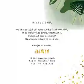 Jullie kiddo kiest natuurlijk ook het allerliefst een eigentijdse communiekaart. Maar waar moet je dan precies op letten? Nou, communie uitnodigingen in een bepaald thema, zoals voetbal of unicorns, zijn helemaal van nu. Kijk dus of er een uitnodiging voor de eerste heilige communie tussenstaat die aansluit bij zijn of haar hobby. En beestachtig mooie communiekaartjes met dieren zijn ook niet meer weg te denken uit het assortiment. Coole koala’s, dolle dino’s, swingende zebra’s en waanzinnige walvissen.. Dieren communiekaarten zijn hartstikke hip. Andere trendy elementen die je vaak terugziet in deze collectie zijn communiekaarten met regenbogen, wegwijzers en fleurige bloemen.