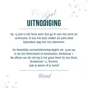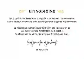 🌿 Schrijf een mooie tekst in je zoons eigen handschrift om de communie uitnodiging van je jongen nog persoonlijker te maken.