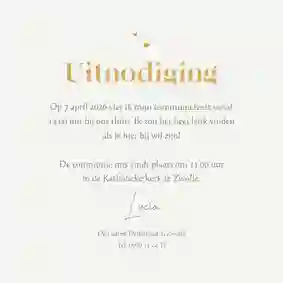 Een stijlvolle bedankkaart om na afloop van een communie te sturen naar vrienden en familie. Met foto, eucalyptus en gouden hartjes.