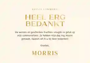 Eenvoudige maar stijlvolle menukaart voor een communiefeest met een grote foto en goudfolie tekst. De achtergrondkleur is aanpasbaar!
