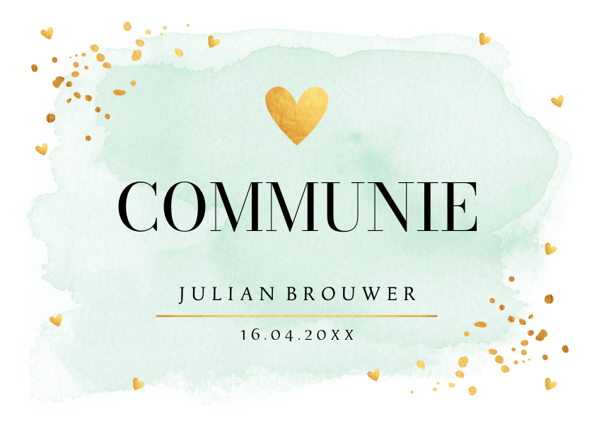 Stijlvolle communiekaart voor een jongen met waterverf groen en goudlook hartjes. Geen goudfolie/inkt!