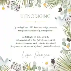 Stijlvolle langwerpig, witte, staande menukaart voor een communie diner of lunch. Met waterverf illustratie van een duifje en takjes en planten.
