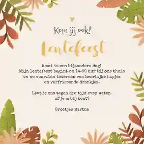 Een gezellig lentefeest verdient ook originele lentefeest uitnodigingen. Met onze kaartmaker tover je elk kaartje in een handomdraai om tot een lentefeest uitnodiging die perfect bij je zonnestraaltje past. Voeg bijvoorbeeld een leuke foto toe om je lentefeest extra persoonlijk aan te kondigen. Zet een zelfgeschreven tekst aan de binnenkant van je kaart of gebruik één van onze voorbeeldteksten. Met verschillende achtergronden, lettertypes en figuren maak jij zeker een originele lentefeest uitnodiging!