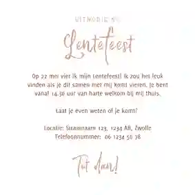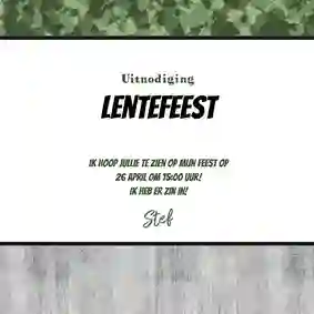 Een gezellig lentefeest verdient ook originele lentefeest uitnodigingen. Met onze kaartmaker tover je elk kaartje in een handomdraai om tot een lentefeest uitnodiging die perfect bij je zonnestraaltje past. Voeg bijvoorbeeld een leuke foto toe om je lentefeest extra persoonlijk aan te kondigen. Zet een zelfgeschreven tekst aan de binnenkant van je kaart of gebruik één van onze voorbeeldteksten. Met verschillende achtergronden, lettertypes en figuren maak jij zeker een originele lentefeest uitnodiging!