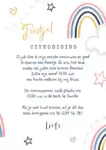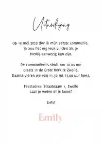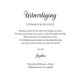 De eerste heilige communie van jullie meisje is een speciale gebeurtenis. En dat wil je natuurlijk vieren met familie, vriendjes en vriendinnetjes. Stuur daarom alvast een communie uitnodiging, zodat je deze bijzondere dag kunt delen met je dierbaarste mensen. Duik samen met jullie dochter in de collectie ‘Communiekaart meisje’ en ga op zoek naar de uitnodiging waar jullie hart sneller van gaat kloppen.
