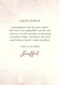 - Schrijf een persoonlijke boodschap op de condoleance kaart. Kun je de juiste woorden niet goed vinden? We tippen je graag deze teksten om iemand gecondoleerd te wensen.