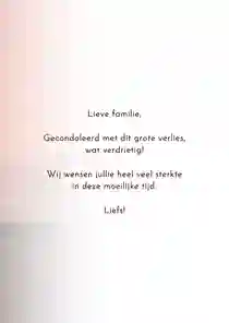 Je wilt er graag voor die bekende zijn als hij een geliefde heeft verloren. Even langsgaan, een maaltijd brengen of een kaart sturen om te condoleren met dit verlies is een mooi gebaar. Wil je een kaart sturen, dan helpen we je daar graag mee.